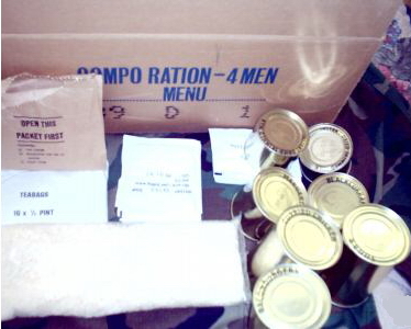 Almost all the food items are already cooked, and only require heating in water before consumption, as it rarely occurs that the soldier cannot manage to ‘brew-up’, he can usually contrive to heat his rations. In addition to the food items, the packs contain tea, sugar, milk, sweets and such sundries as matches, soap, a can-opener and water-sterilizing outfits.