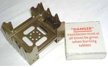 The hexamine fuel tablet is a form of solid fuel, 8 tablets to a packet. The tablets burn smokelessly, have a high energy