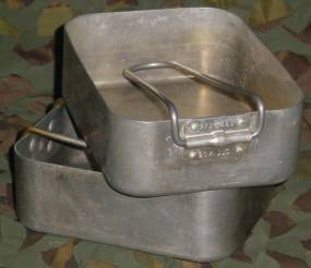 Mess tins have maintained the same basic design since the mid 1930's. Mess tins are generally rectangular with rounded off edges - the rounded edges are easier to clean inside than a sharp corner. Most mess tins are supplied as a set, with one slightly larger than the other, allowing them to nestle together for easy packing. This arrangement is also useful when using the tins for boiling, as the smaller tin can be used to hold the liquid, with the larger tin placed on top to act as a lid. In order to save weight, some designs stick with a single mess tin with a lid, with the lid often having a secondary role as a frying pan.