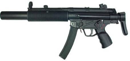 which is a version of the MP5SD3 with a retractable metal stock, front sight post with tritium-illuminated dot and a stainless steel suppressor. This